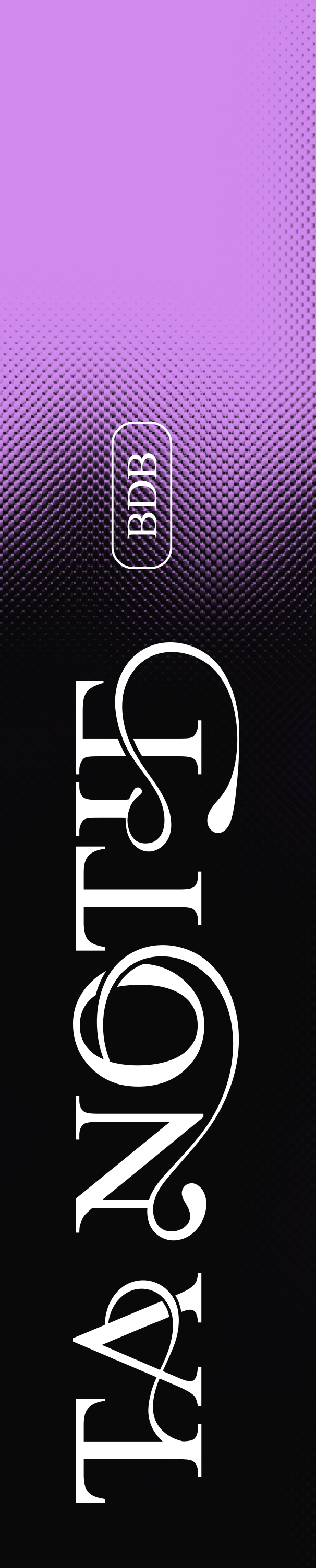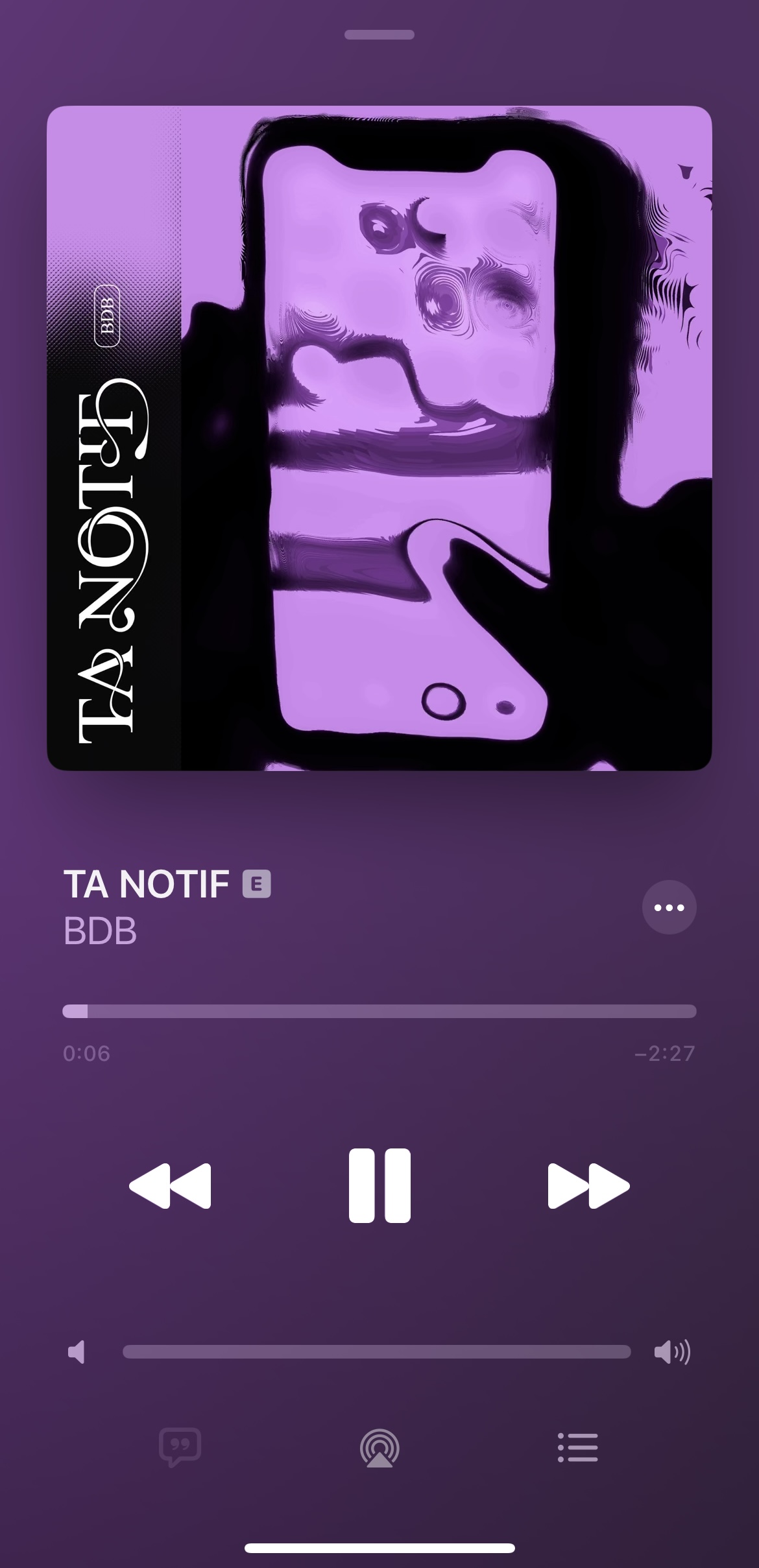 Pochette single "Ta notif" pour BDB Pour la sortie de son single « Ta notif », l’artiste BDB m’a contacté pour réaliser la pochette de la musique. J’ai créee la typographie sur Illustrator que j’ai ensuite assemblé sur Photoshop avec les autres images. "Ta notif", Illustrator et Photoshop, 2023 Zoom sur la typographie et la texture Spotify de l'artiste avec la pochette Typographie "Ta notif", Illustrator